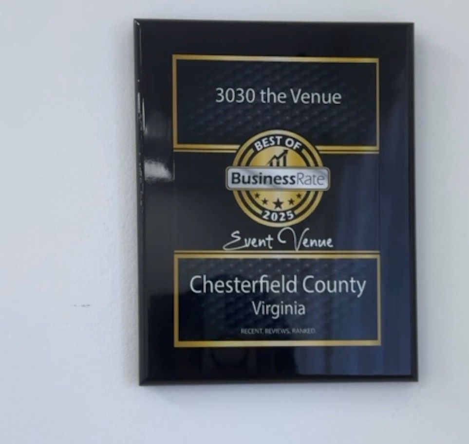 At 3030 the Venue, we believe every occasion shines, and we are committed to making your special moments unforgettable. We offer a modern venue and affordable, yet elegant, décor packages tailored to your needs. We are proud to have received the 2026 Roger Habeck Small Business of the Year Award from the Chesterfield Chamber of Commerce and to have been recognized as the number one event venue in Chesterfield County for 2025 by BusinessRate.com.